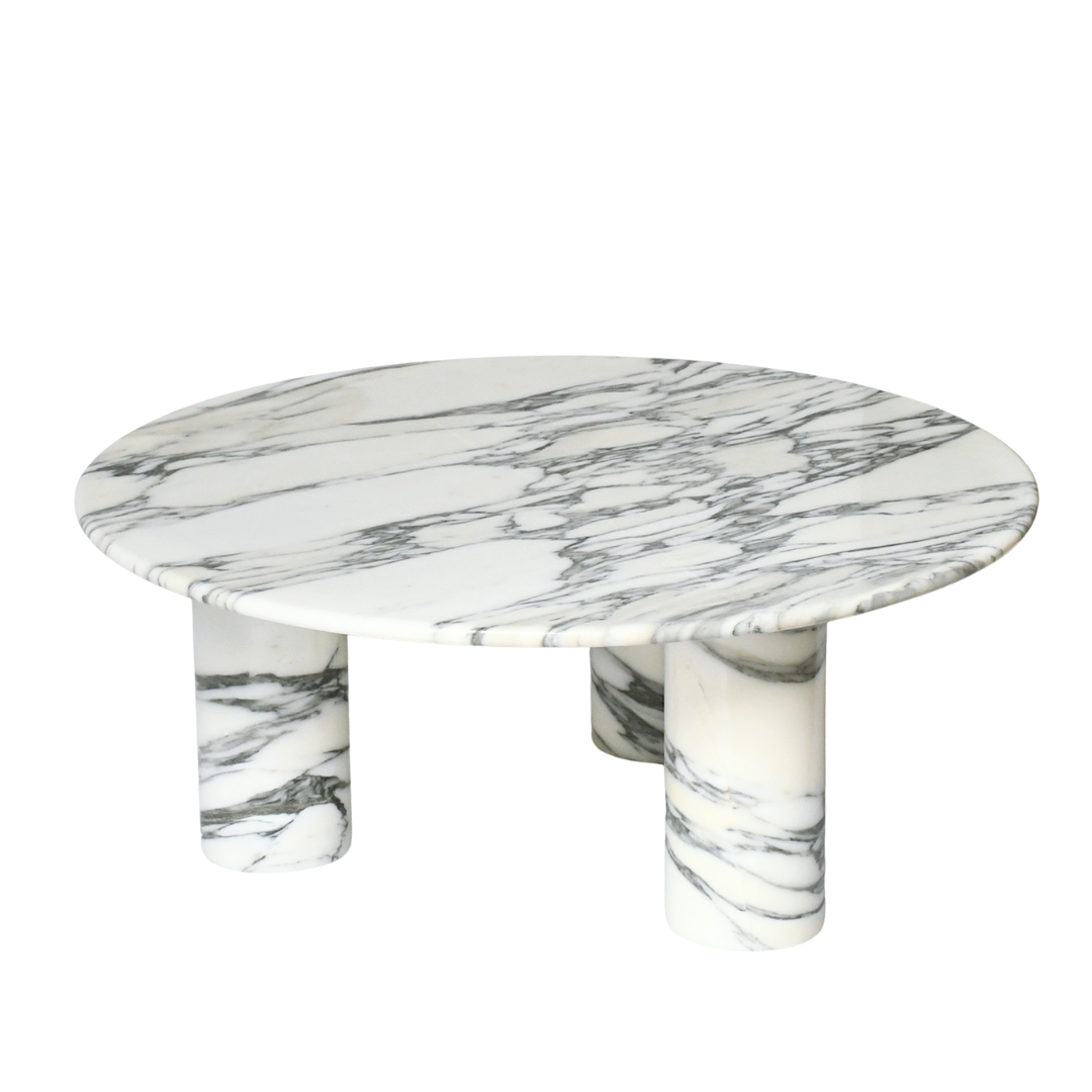 This natural marble coffee table is crafted from exquisite Arabescato marble, known for its luminous white background and bold, flowing grey veining. The round tabletop rests on three cylindrical legs, creating a balanced, sculptural silhouette that feels both modern and timeless. The honed finish enhances the marble’s natural movement and soft texture, while the unique veining pattern ensures every piece is one of a kind. Elegant yet substantial, this coffee table brings refined sophistication to any living space.