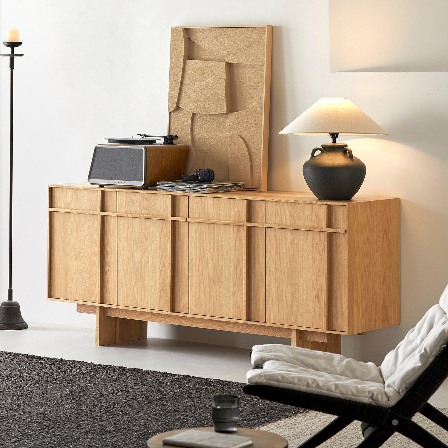 Crafted with a solid oak frame and oak veneer panels, this buffet showcases natural grain patterns and lasting durability. The smooth matte finish enhances the wood’s organic warmth
