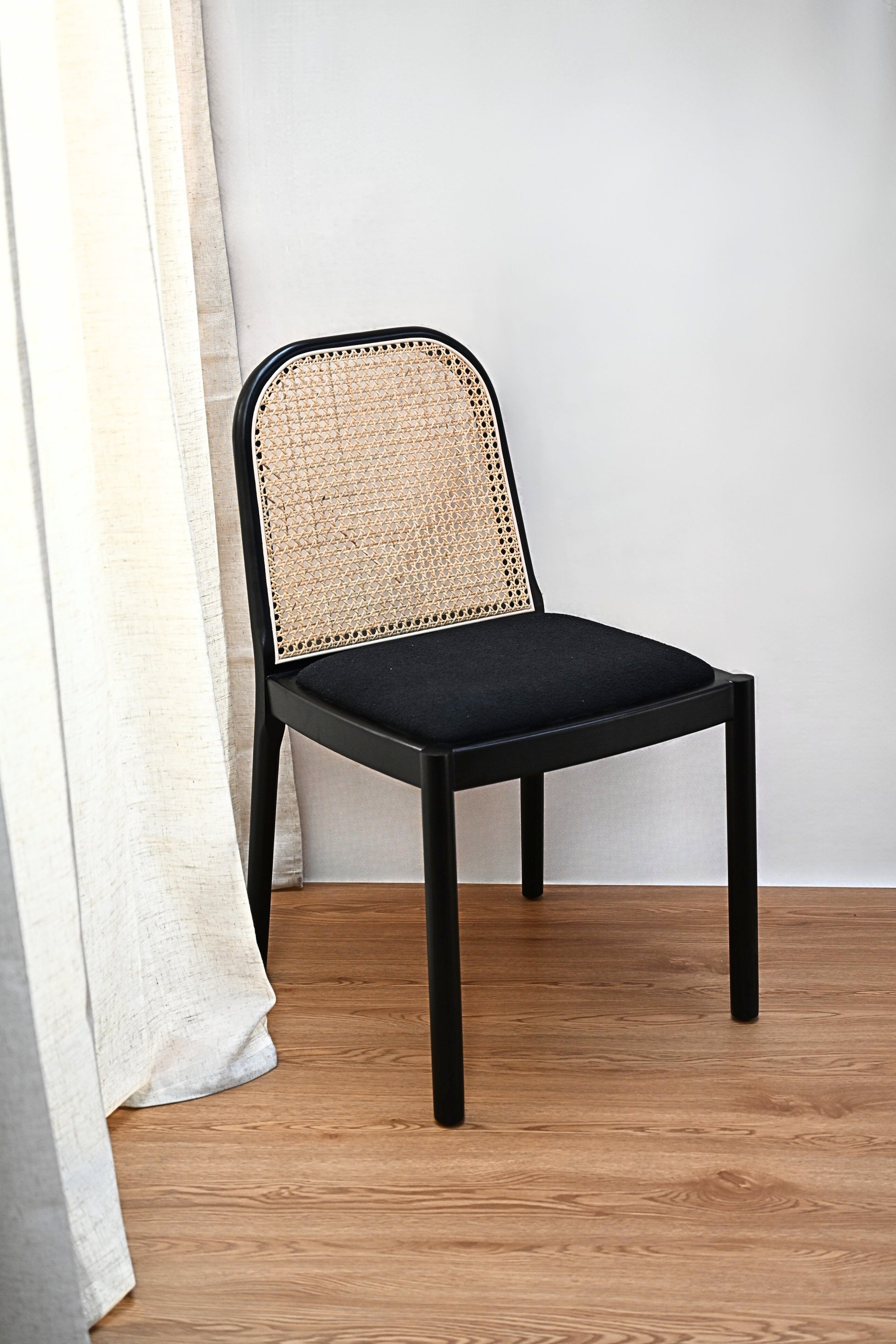 This dining chair features a sleek, modern silhouette with a warm blend of natural textures. Crafted from solid ash wood, the frame offers durability and a refined matte black finish that grounds the design. The gently curved backrest is composed of handwoven natural rattan, adding a touch of organic charm and breathability. A plush, fleece-upholstered seat in deep black provides soft, cozy comfort, making it an inviting choice for long meals and conversations. Perfect for contemporary, Scandinavian, or minimalist interiors, this chair balances elegance with everyday functionality.
