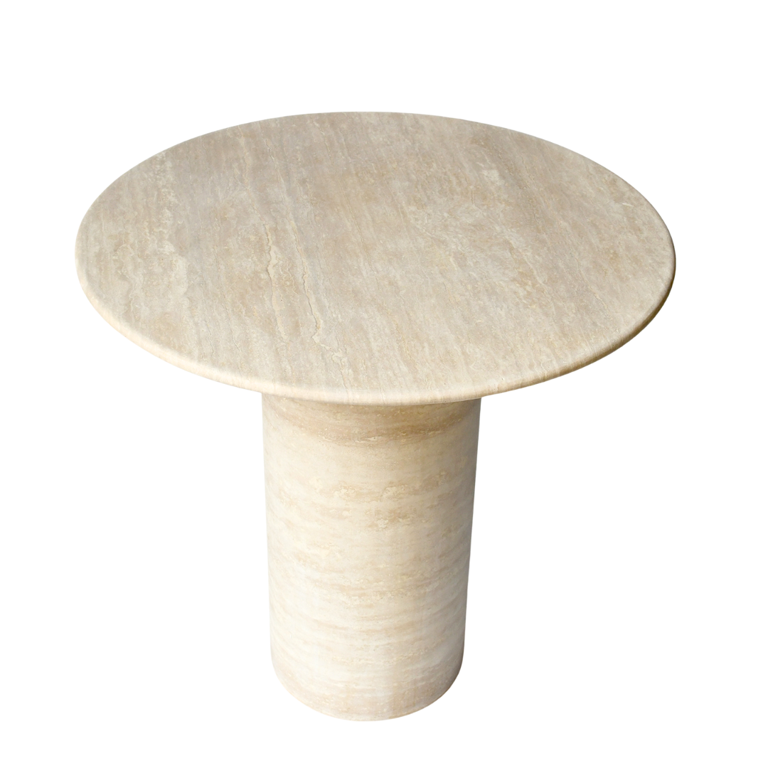 This natural travertine bistro table exudes understated elegance with its clean, cylindrical base and smooth round top. Crafted from solid travertine in warm beige tones with subtle veining, it brings a refined, organic charm to any setting. The minimalist silhouette highlights the natural beauty of the stone, making it a timeless addition to modern dining corners, compact spaces, or alfresco areas. Its sturdy build and polished finish offer both durability and sophistication.